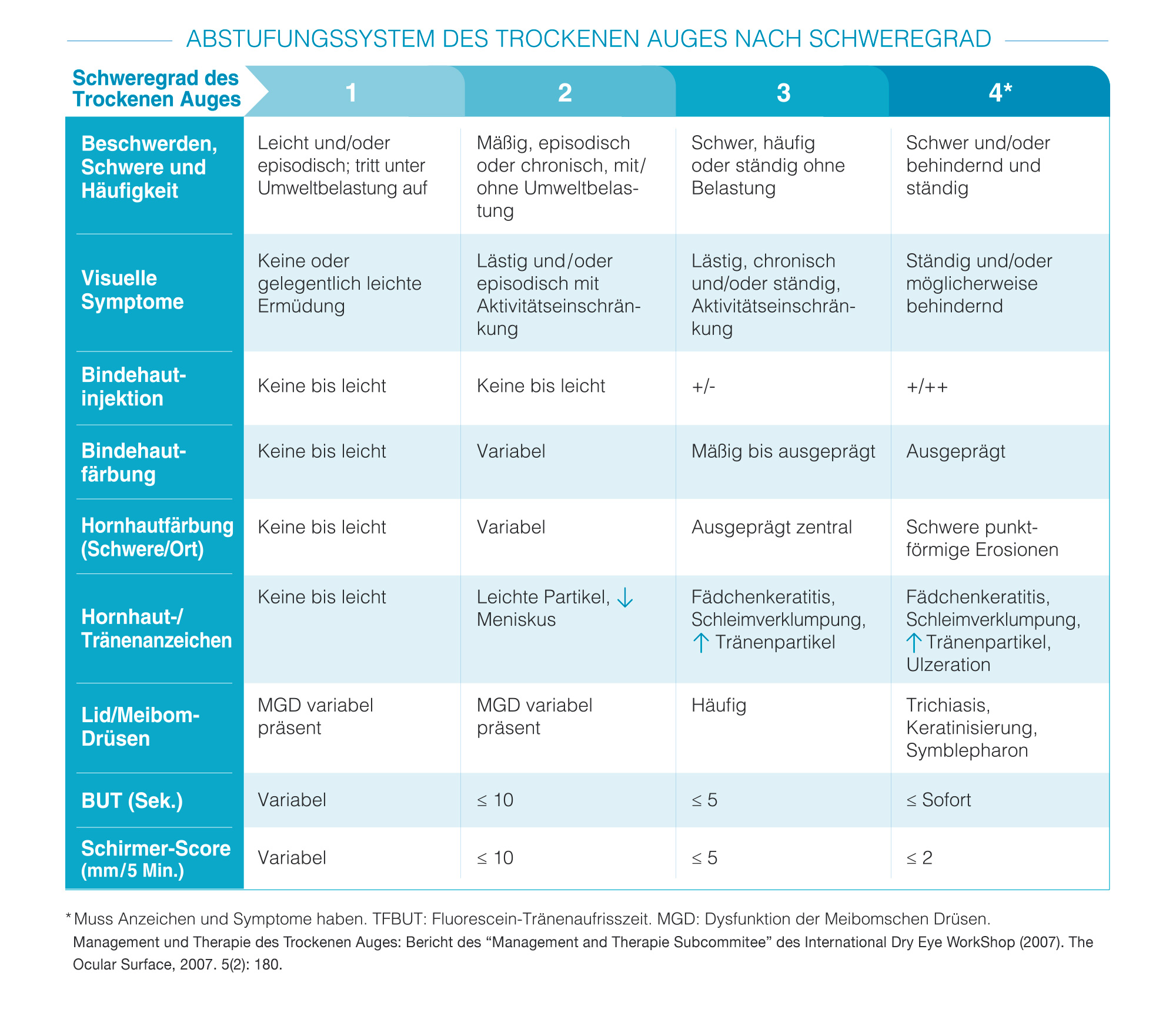 Die meisten Fachleute akzeptieren eine Klassifizierung der Störung "Augentrockenheit" in vier Grade.
